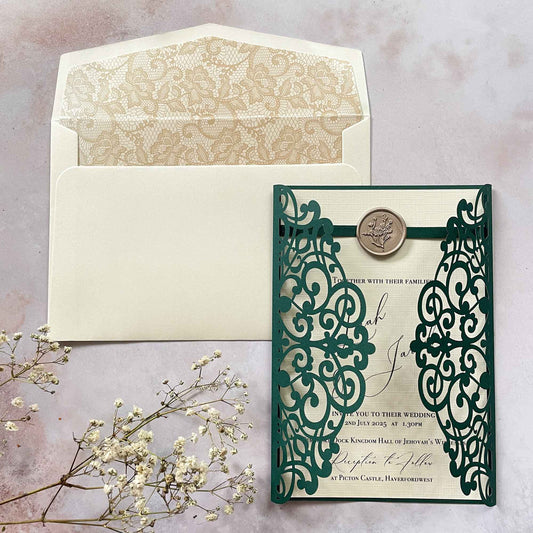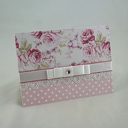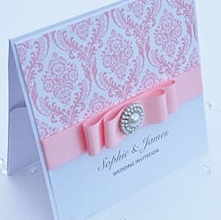 Use your choice of our patterned papers with one of our laser cut, or pocket invitations. To really bring your handcrafted wedding invitations to life add one of our crystal, pearl or gold embellishments. Or how about a length of ribbon or lace along with a buckle. One of our most popular products to add to our patterned paper is our selection of bows, or keys and charms. We also recommend our self adhesive stickers which are perfect for creating cheap wedding invites.