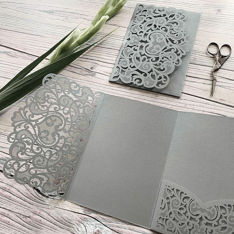 Aufwendige, blanko, lasergeschnittene Einladung in perlmuttfarbenem Grau.