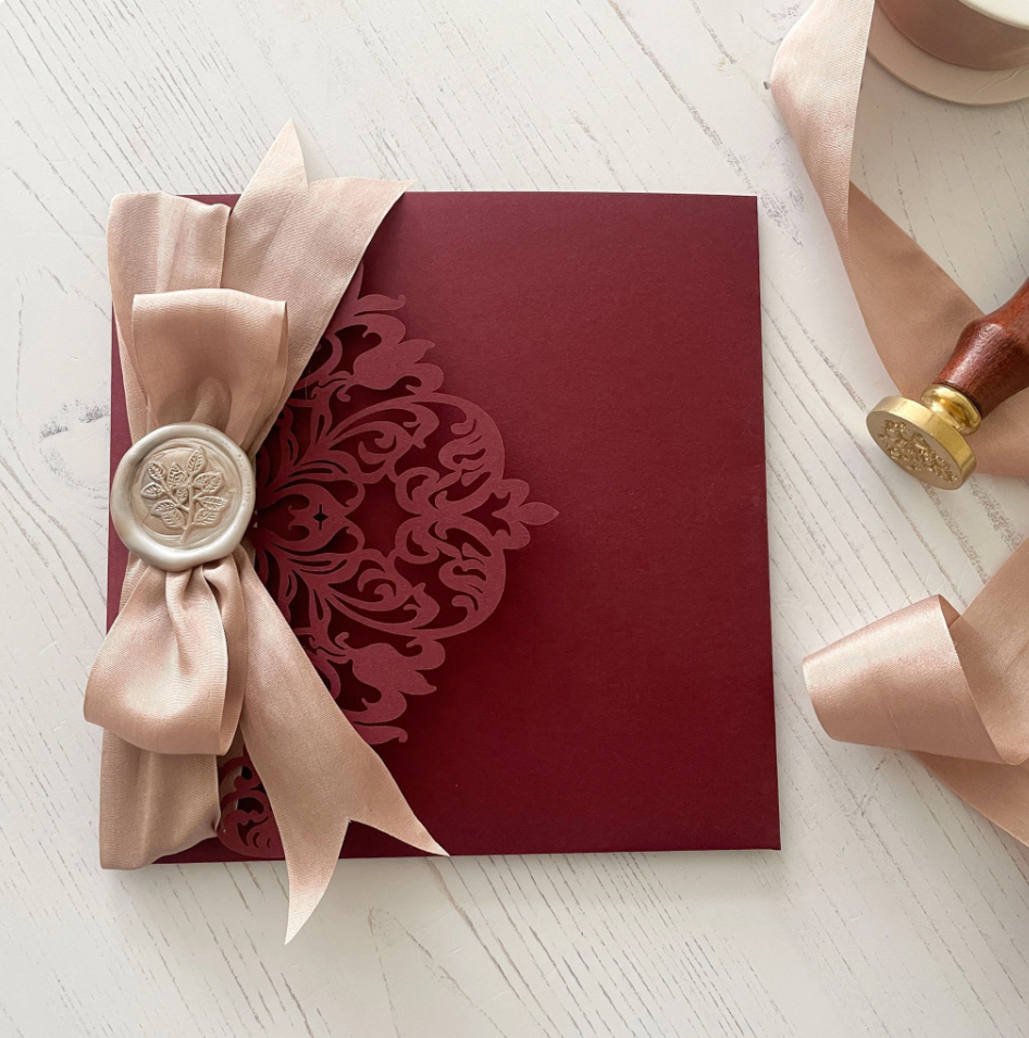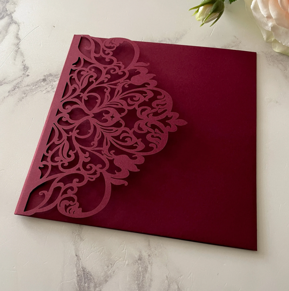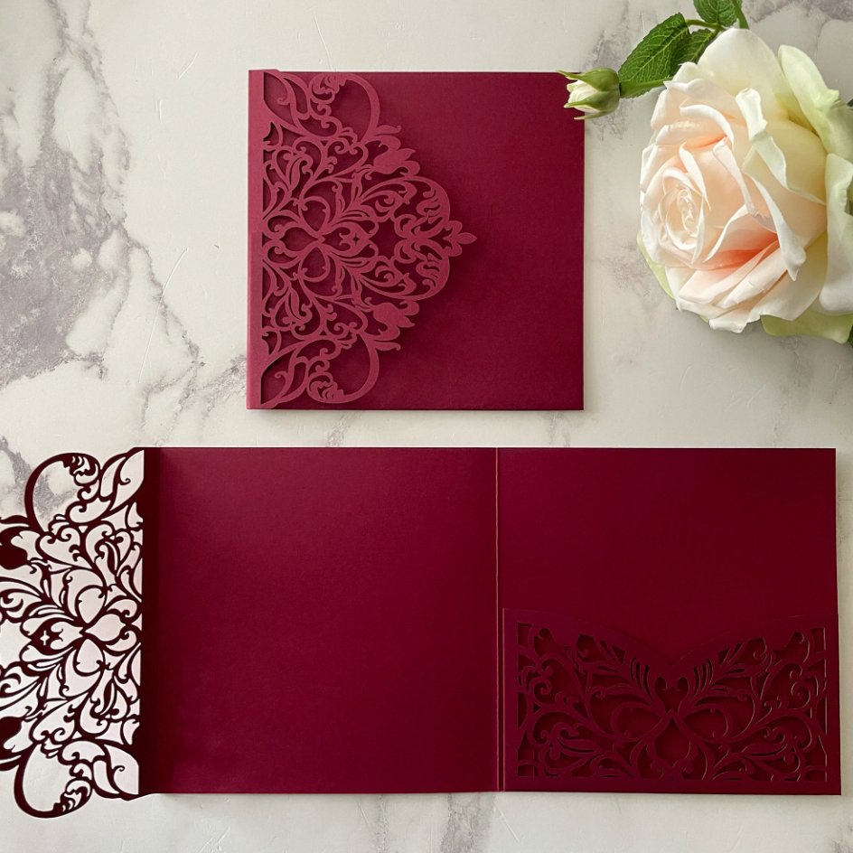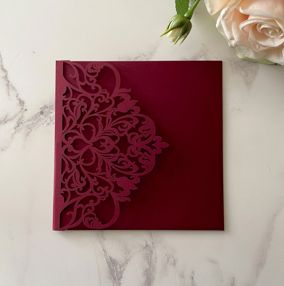 Diese wunderschöne Tascheneinladung hat ein aufwendiges Laserschnitt-Design auf der Vorderseite. Das Taschenfaltdesign lässt sich öffnen und gibt eine schöne, lasergeschnittene Tasche frei, die viel Platz für Ihre Einladung, Gästeinformationen, RSVP-Karten usw. bietet.