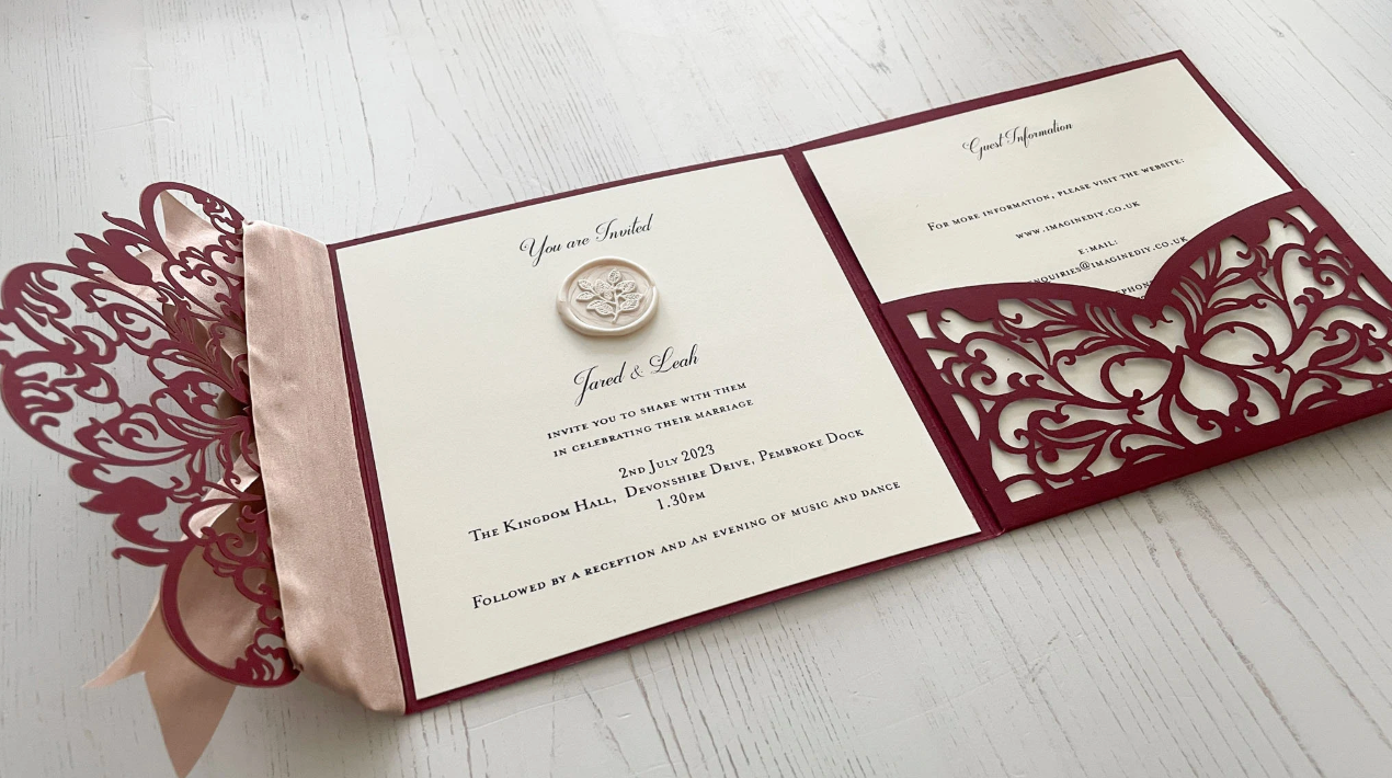 Luxuriöse Einladungstaschen mit zarter, lasergeschnittener Spitze.