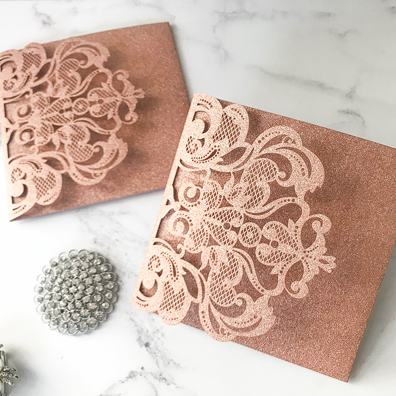 Invito a nozze tascabile con taglio laser rococò - glitter oro rosa