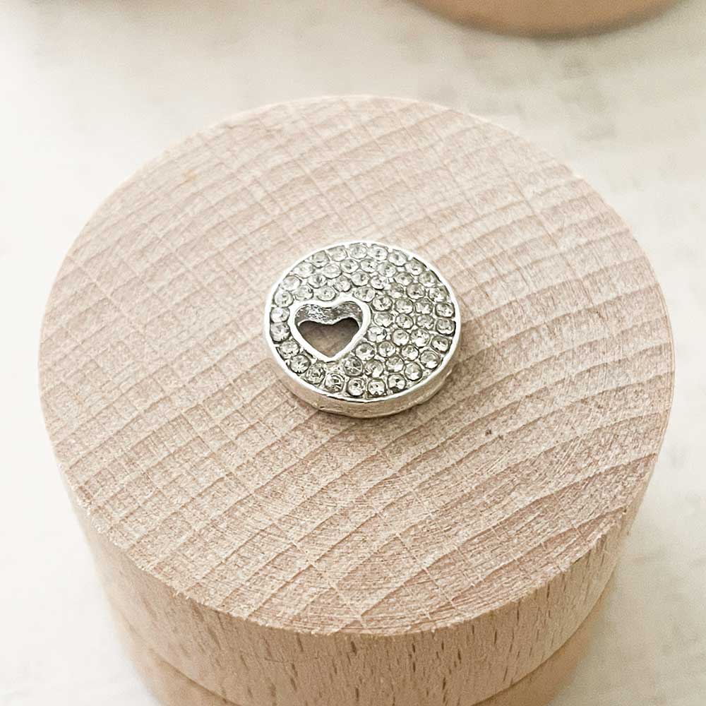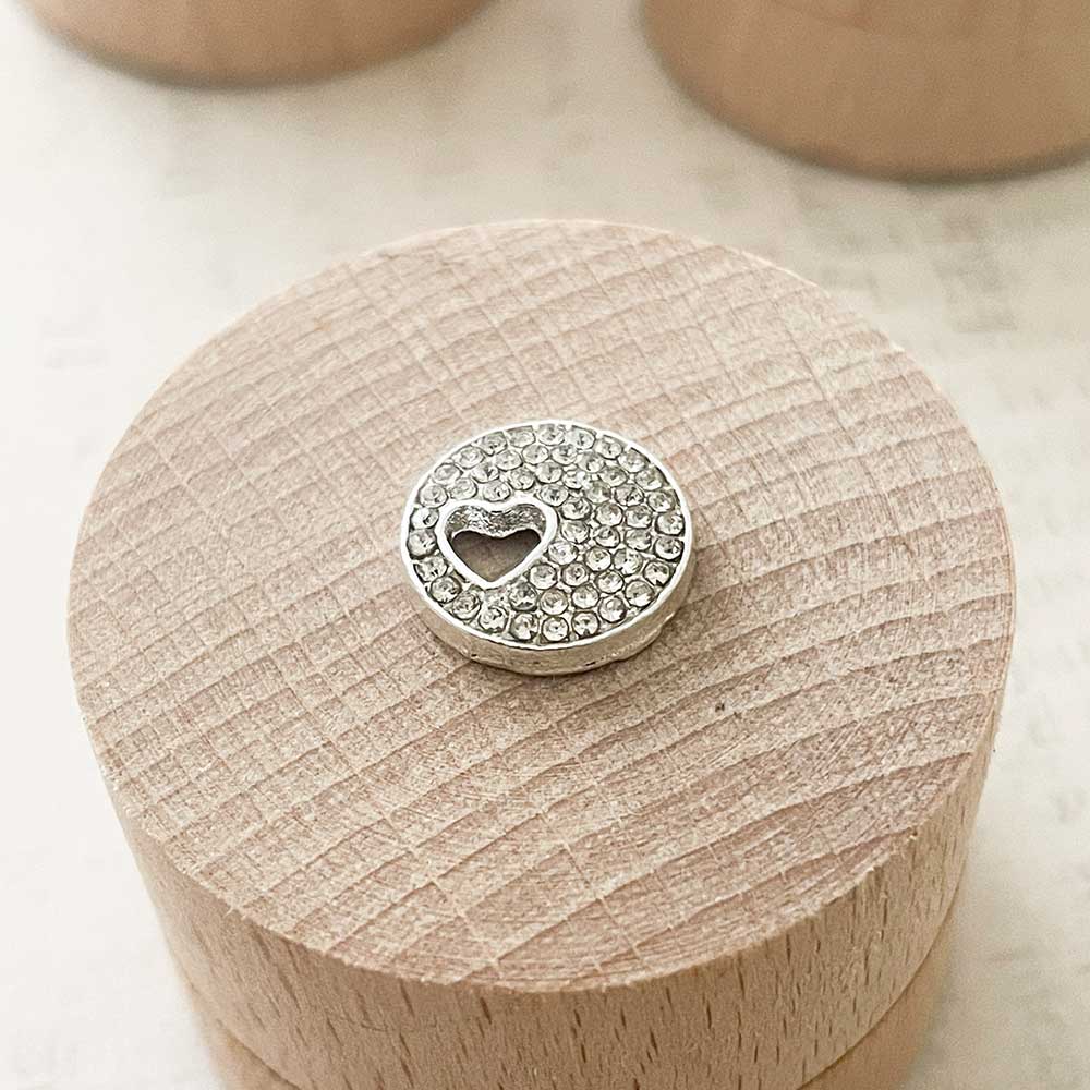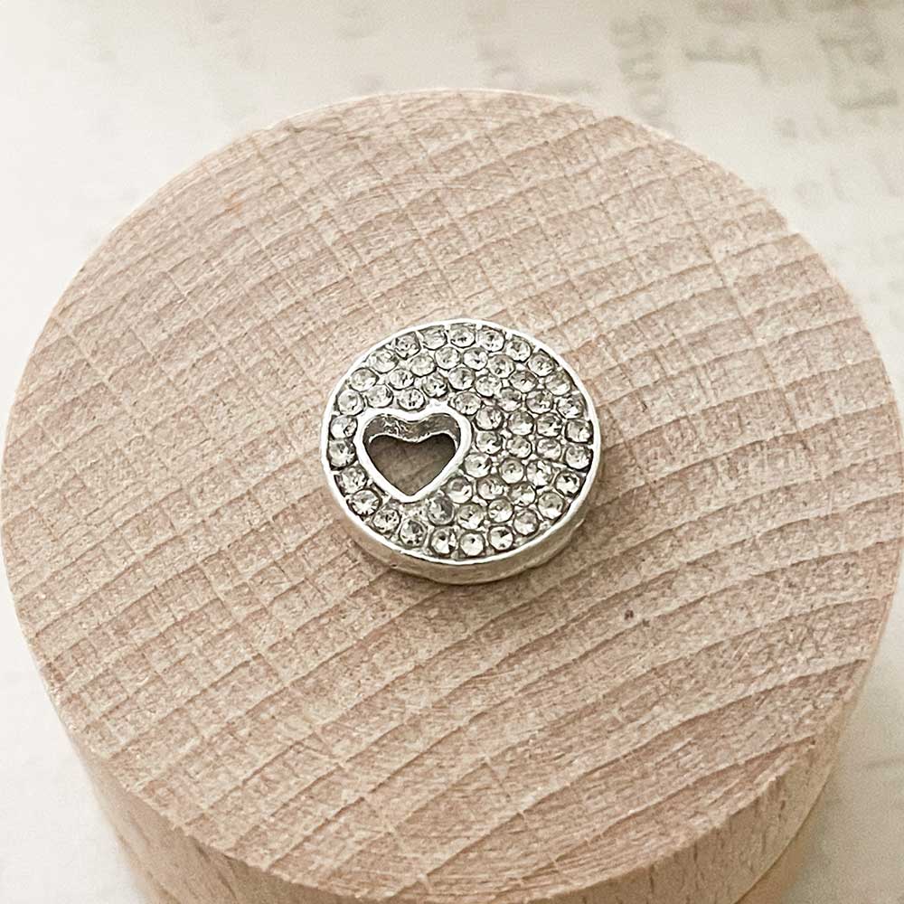 A small cluster of sparkling crystals set within a round frame. As if that wasn't enough, a small cut out heart adds the perfect romantic touch.