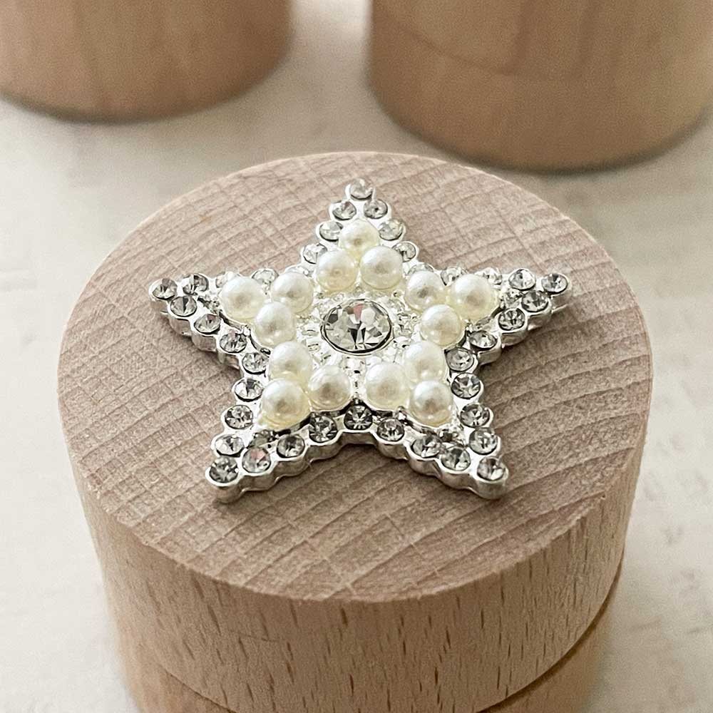 A beautiful star shaped embellishment featuring a larger central crystal surrounded by a row of crystals and an outer row of sparkling crystals.