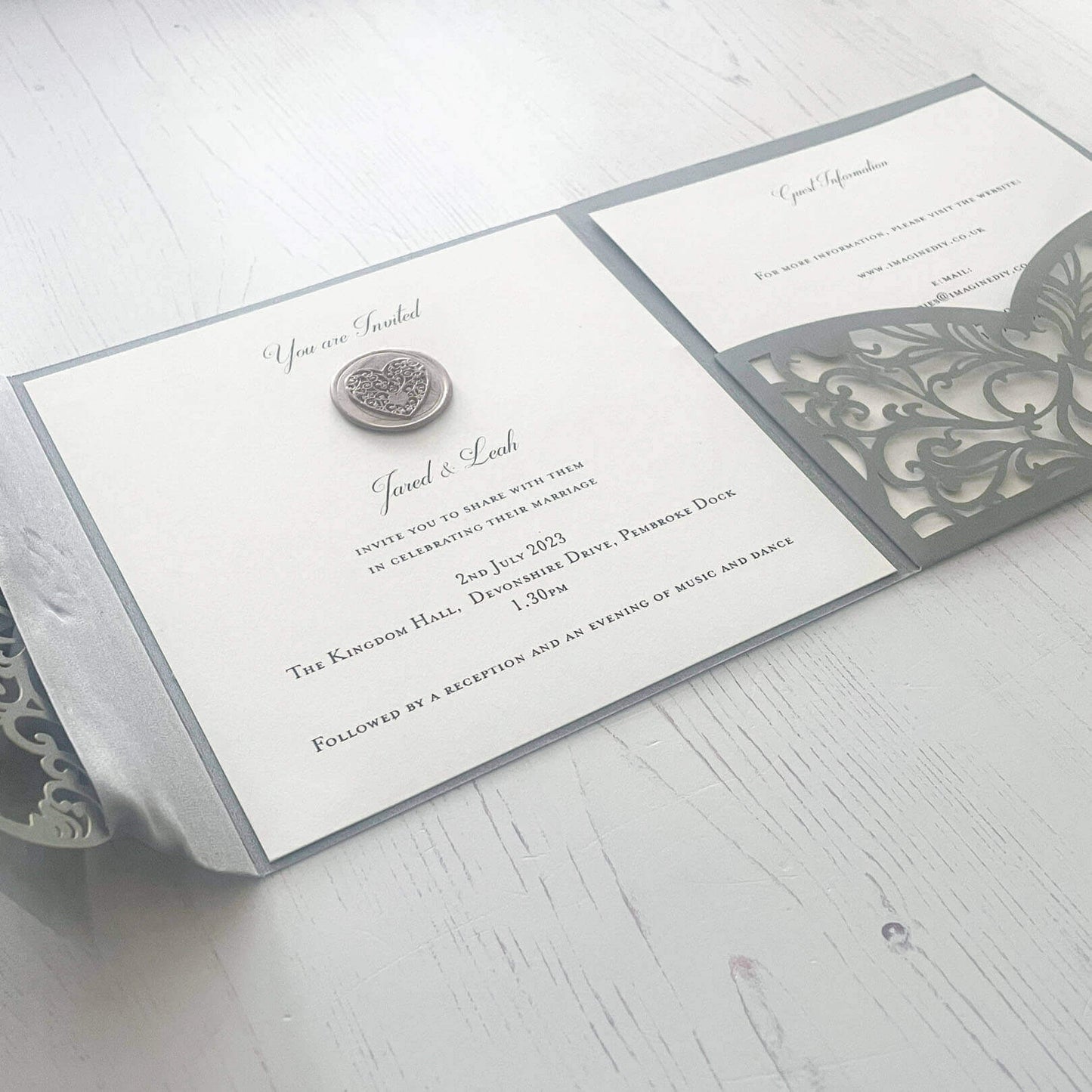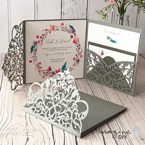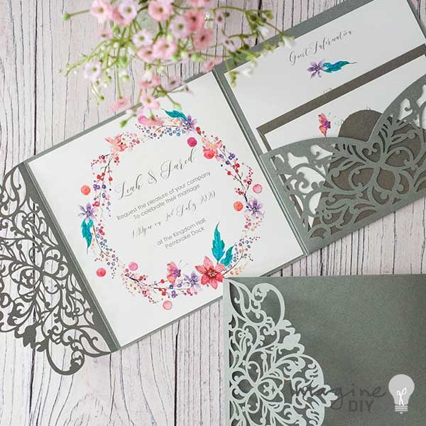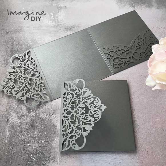 This beautiful pocket fold invitation has an intricate laser cut design on the front. The pocket fold design opens up to reveal a beautiful laser cut pocket, allowing plenty of room for your invitation, guest information, RSVP cards etc.